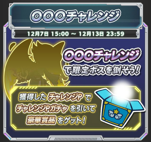 コラボ期間後半に、コラボイベント「〇〇〇チャレンジ」を開催します。「〇〇〇チャレンジ」で限定ボスを倒すと豪華賞品がゲットできます。〇〇〇に何が入るかは続報をお待ちください!