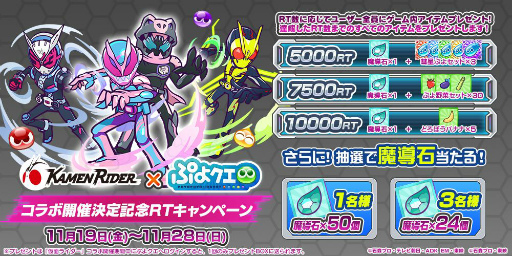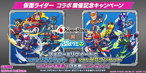 『ぷよクエ』公式アカウント(@puyoquest )をフォローして、対象のツイートをリツイートすると、コラボキャラクター「ver.ジオウ」or「ver.ゼロワン」のいずれかを抽選で3名様にプレゼントするキャンペーンを開催中です。