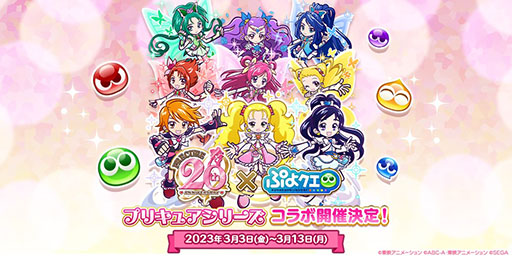 株式会社セガは、大好評配信中のパズルRPG『ぷよぷよ!!クエスト(以下、『ぷよクエ』)』にてテレビアニメ『プリキュア』シリーズとのコラボレーションイベントを、2023年3月3日(金)より開催することをお知らせします。
