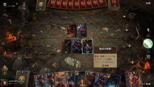 「グウェント」には,カードゲームにしては珍しくマナやエネルギーの概念がない。したがって1ターン目から強いカードを切ることができるが,その代わり原則としてターンごとに1枚のカードしか場に出せず,相手の除去カードによって簡単に消されてしまう危険性もある。相手の持っているカードを予測しながら,速やかに自軍を展開していくことが重要になる,スリリングなゲームなのだ。