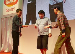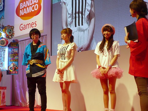 ステージでは「エトウ塾長」こと,バンダイナムコゲームス 太鼓の達人開発チーム ディレクターの江藤浩平氏が登場。「特別門下生」となった,ファッション雑誌「Popteen」モデルの舟山久美子さんと椎名ひかりさんに上達の秘訣を伝授した。流行曲からボーカロイド曲まで,幅広い曲を収録した太鼓の達人の魅力が存分に発揮されたステージとなっていた。