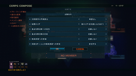 今作では、部隊編成時に出撃するミッションの希望を設定できるようになった。ここでは、対戦相手の所属勢力や、戦闘エリア、各種作戦への志願の有無などを設定し、条件に合った敵部隊と戦うことになる