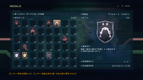 今作ではトロフィーや実績の他に、勲章が個人の勲章。撃破数や出撃の種類など、多彩な勲章がラインナップ。すべての勲章を埋めて、最強傭兵を目指せ