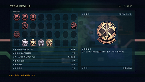 チームの勲章。個人と同じくチーム単位での勲章も存在。メンバーと共闘し、より多くの勲章を獲得せよ