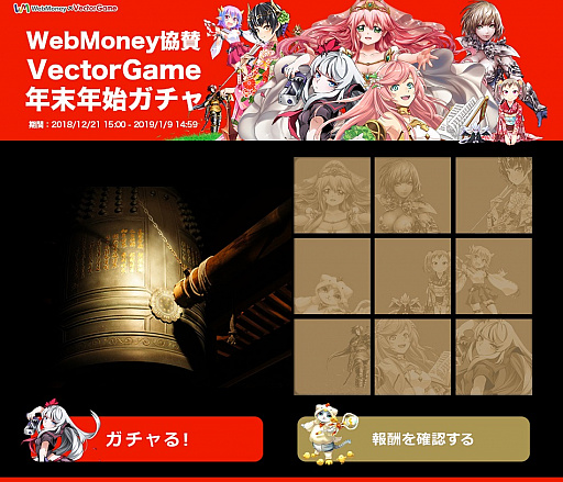 株式会社ベクター(本社:東京都新宿区、代表取締役社長:梶並 伸博)は、当社が運営するオンラインゲームポータル「VectorGame」において、2018年12月21日(金)15:00より、「WebMoney協賛 VectorGame年末年始ガチャ」を開催いたします。