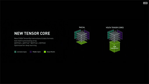 New Tensor Core」を持ち,これにより最大120 TFLOPSの演算性能を実現するとのことだ。Huang氏は,このNew Tensor Coreによって,Googleの深層学習フレームワーク「Tensor Flow」は従来比で12倍の速度で処理できると語っていた。