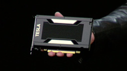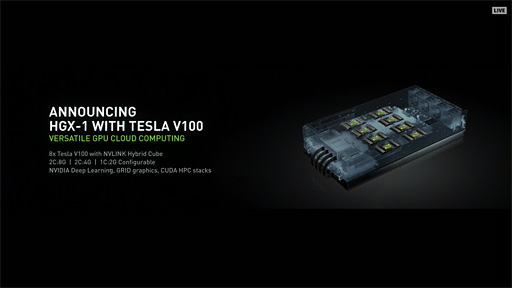 FHHL」(Full Hight, Half Length)も発表している。「CDカードサイズ」(Huang氏)でパッシブ冷却方式を採用するカード版Tesla V100は,深層学習においてSkylake世代のCPUに対して15〜20倍の性能を持つとのこと。「3000ドルでコンピュータにTesla V100を追加できる」とも氏は語っていたので,カード版の価格はその程度に設定される可能性が高い。