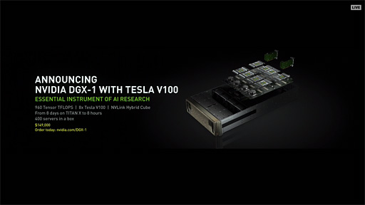 DGX-1 With Tesla V100。8基のTesla V100を搭載して14万9000ドルとなっている。注文受付は発表と同時に始まっているが,出荷は第3四半期予定とのことだ
