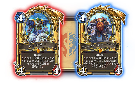 プレイヤーは、ホードかアライアンスのどちらかの陣営を選択することで、陣営に応じたゴールデンレジェンドカードを1枚無料で獲得できます※ ――ホードにつくとシャーマンの長老「ドレクサー」、アライアンスにつくと山の王「ヴァンダル・ストームパイク」がもらえます。