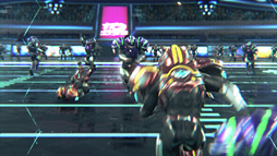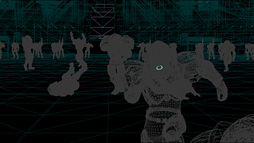 今回の取材に応じてくれた本プロジェクトの中核メンバーに6〜7人のアーティストを加えたチームで,右も左も分からないまま,手探りで制作した結果できあがったのが,近未来のSFテイストが盛り込まれたアメリカンフットボール的なデモ「ULTIMATE BOWL」である。最初のリアルタイムデモプロジェクトということで,社内での通称として「kuro 1.0」という名が与えられている本作だが,雰囲気としては,架空のゲームのオープニング映像のようなものになっている。