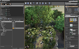 樹木は幹の部分を手動でモデリングしましたが,風で揺れるような部分,具体的には枝や葉などの表現には,UE4に統合されている植物生成ミドルウェア「SpeedTree」を利用しています。