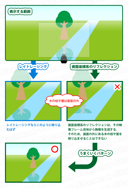 RLRとSSRはいずれも,描画結果の映像フレームと,それに対応する奥行き情報(=深度値)だけを用いて,視線の反射方向に対して局所的なレイトレーシングを行うテクニックである。RLRとSSRにおいて映り込むのは,描画結果の映像フレームそのものから生成されるものとなるため,その瞬間の映像フレームに描かれていないオブジェクトは,当たり前だが,鏡像として描かれないのだ。