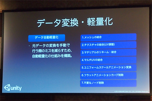 また,兼古氏によると「PS2版のデータは,ハードの特性上,ドローコール(の数)を気にしない作りになっていた」という。PS2はドローコールが軽かったため3Dモデルのメッシュやマテリアルが,その特性にあわせて作られていたそうだ。これをそのままUnityでスマートフォンに持ち込むと,動作の快適さに悪影響を及ぼす。それもあって,ドローコールを減らす意味も含めたデータの軽量化が必要になったという。