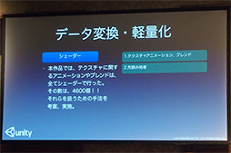 アニメーションも同様に軽量化が必要で,こちらも多くを自動化したそうだ。兼古氏は,「移植では一般的な作業が多かった」と断ったうえで,スケールアニメーションの変換を例に説明を行った。具体的には,「トランスフォームのスケールアニメーションを頂点シェーダ側に渡して,頂点位置を動かすことでスケールする」ように変えたという。これで「60msほどかかっていた処理が15msで済み,効果があった」(兼古氏)そうだ。