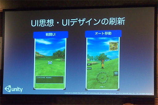 辰田氏は,スマートフォン版UIの注目すべき点を2つ挙げた。その1つはNPCとの会話だ。タッチパネルで仮想ゲームパッドを操作する場合,意図したとおりににキャラクターを移動させられないことがある。