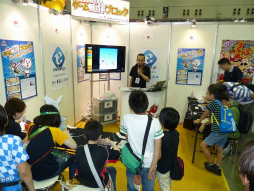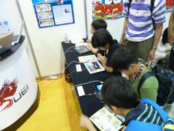 ユビキタスエンターテインメントのブースでは,同社が開発した「enchant.js」を採用した「コロコロゲーム工作(クラフト)ブロック」を使った,ゲーム制作のワークショップが開かれていた。タブレットPCでブロックを組み合わせると,ゲームのプログラムが完成するというもの。とくに小学校高学年以上の男の子が興味津々で,夢中になってゲーム作りに励んでいた。