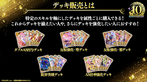過去に実施した黒ウィズミュージアム同様、クエストをクリアすることでコインとピースを集めることができます。ピースを全て集めることで10周年を記念して製作した、今までの周年記念イベント精霊が勢ぞろいしたイラストが完成し、報酬カードとしてゲットすることができます!また、イラストは全部で5種類あり、そのままデッキに並べて使うことができるため、是非全部手に入れてご使用ください。さらに、今回契約レベル6の状態でゲットすることができます。これを機にデッキスキンとしてもご使用いただければ幸いです。