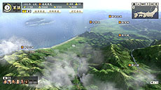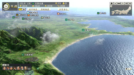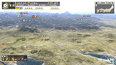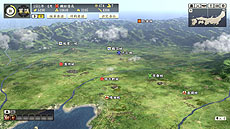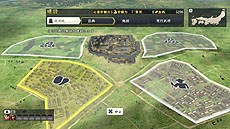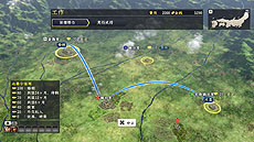 部隊の進軍ルートを設定する画面です。多面作戦を繰り広げる本作の合戦では、部隊の進軍ルートの設定が戦局を大きく左右します。敵を最短距離で攻めるだけでなく、遠回りして迂回することで敵を挟撃したり、陽動によって敵を引きつける間に他の城を落としたりと、戦局全体を把握しながら大きな尺度で采配を振るえます。 |