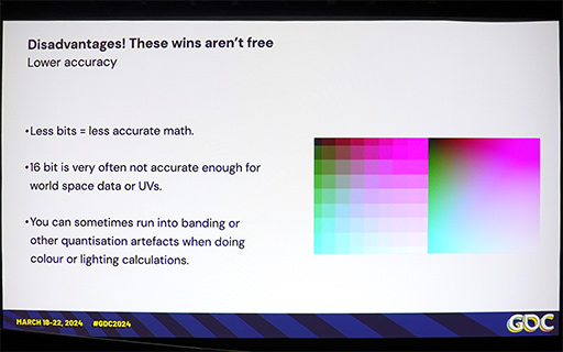 Griffin-Lira氏の肌感では,携帯端末向けGPUは,もともと「FP16を積極活用していこう」という思想で設計されているためか,FP16化の恩恵を得やすかったそうだ。それに対して,PCや据え置き型ゲーム機では,FP16化の恩恵は少なかったと振り返っていた。
