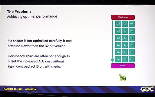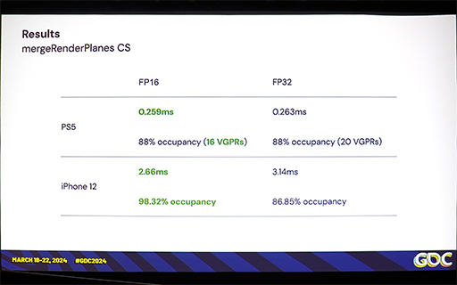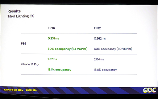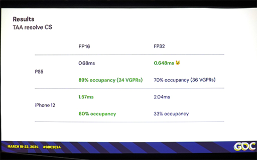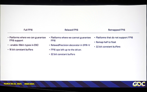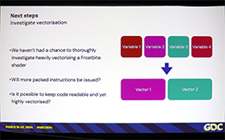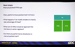 Griffin-Lira氏は,FrostbiteエンジンのFP16化について,「まだ,すべてを試せたわけではない」と振り返っており,今後は,各GPUが持つ独特なベクトル命令の仕様に合わせた,より深い最適化に挑戦してみたいと述べていた。