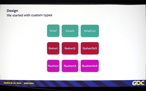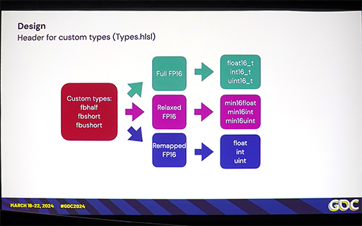 ここでGriffin-Lira氏は,FrostbiteのFP16 APIの設計において,対象ハードウェア(GPU)を3種類にカテゴリー分けしたと述べる。つまり,3種類の対象ハードウェアを3段階のFP16対応レベルに分けて,FP16 APIを設計したということだ。