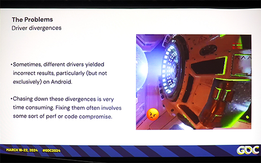 ただ,雑多なAndroid端末においては,GPUドライバソフトの完成度が低いことも多い。そのため,シェーダコードに問題がなくても,正体不明のライティング結果になることも多いとのこと。そうした端末での原因探しは,ほとんどあきらめるしかなかったようだ。