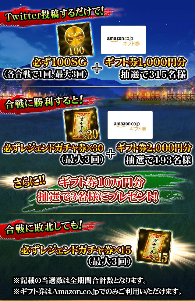 「戦国炎舞 -KIZNA-」,総額100万円分のAmazonギフト券などをプレゼント