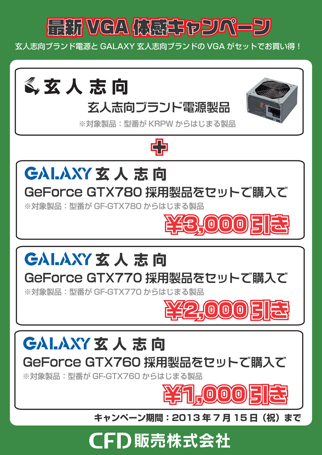 GALAXY玄人志向,GTX 700シリーズと電源の同時購入で最大3000円引き