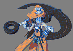 そこでアークシステムワークスは,キャラクターの表情や,キャラクターの衣装やアクセサリーにおける象徴的な部分のディテールを強調すべく,バトルシーン用3Dモデルでは近景用3Dモデルと造形を変えることにした。それこそミリアの場合,バトルシーン用の3Dモデルでは,意図的に目を大きくするなどの変更を行っている,といった具合だ。
