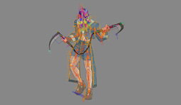 バトル中のキャラクターは顔面が小さく描かれます。衣装やアクセサリー類も同様です。ただ,その3Dモデルでは,アップになったときに,キャラクターに与えられたアイデンティティを表現し切れません。そのため,バトル中のための3Dモデルと,カメラが寄ったときに用いる3Dモデルを個別に制作することにしました。
