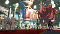 ライトブルームもディフュージョンも,明部がぼやっと溢れ出す効果を与えるものだが,それぞれは別系統のフィルタ処理として実装されているとのこと。具体的には,ライトブルームフィルタを適用したあと,さらにディフュージョンフィルタを適用してあるそうだ。ディフュージョンは,散乱の仕方こそ控えめながら,ある程度明るい色のところにはおおむね適用されている印象を受ける。石渡氏は,「メインの格闘ゲームパートでは,あまりボヤっとしたタッチにしてしまうと遊びにくくなってしまうので,こうしたポストエフェクトが強めにかかるのはカットシーンが中心」になると述べていた。