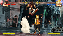 ちなみに,いま紹介したエフェクト群のうち,煙などの純然たるエフェクト類にライティングはなされておらず,陰影などはテクスチャによる焼き込みとなっている。輪郭線を出す処理も適用されていない。炎や閃光などの発光系エフェクトは,光って見えるだけで,実際には周囲を照らしていないが,これは,2D格闘の場合,条件によってエフェクトの見映えが変わってしまうと,プレイ感覚に支障が出る懸念があるためだ。