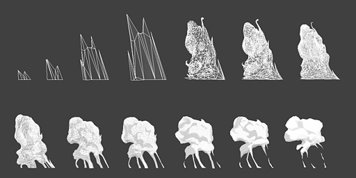 たとえば,下に示した煙エフェクトなどは,ちょっとした流体アニメーションのように見えるが,実は,アーティストの手によって1コマ1コマモデリングされているのだ。舞い上がって膨らみ,破裂するような爆煙エフェクトも,そう見えるようにアーティストが1コマ1コマ作っているのである。