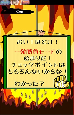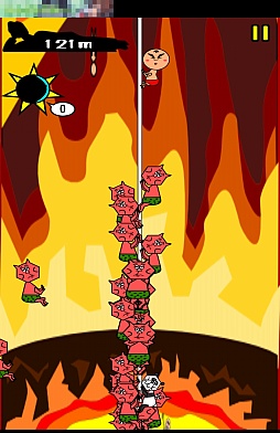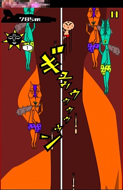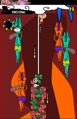 ときどき超高速で糸を登っていく小動物にタップできると,カンダタが短時間だが加速して鬼を引き離し,記録を伸ばすことができる。