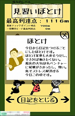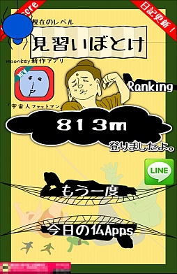 下から迫る鬼がカンダタを追い抜いたり,鬼にまぎれて登ってくる動物たちを間違って落としてしまうと,即座に蜘蛛の糸が切れてゲームオーバー。カンダタが登れた「距離」がスコアとなり,ワールドランキングで競い合うことができる。
