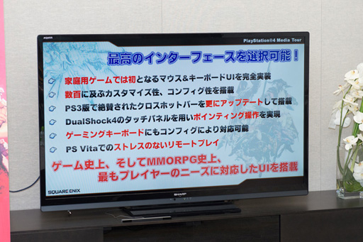 PS4版新生FFXIVは,すべてのコンテンツがリモートプレイに対応しており,これによってテレビの前を離れてゲームがプレイできるようになると,その利点を説明した。また,PS Vitaではどうしてもボタンの数が足りなくなるため,リモートプレイ用にキーコンフィグも保存できるように作っているとのこと。しかもリモートプレイで接続したときには,それが自動で適用されるようになるらしく,スムーズに楽しめるのが特徴だ。