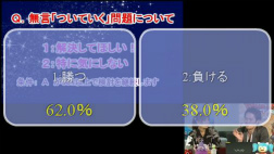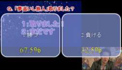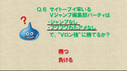 | クイズコーナーの最終問題は,Vジャンプ編集部の斉藤氏率いるパーティによるVロン強とのバトル結果を予想するというもの。勝利したものの敗北を予想した視聴者が多く,空気を読んでないとノーカン扱いにされると,再戦では見事に(?)敗北した | |