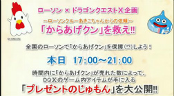 | ゲーム内で使える「プレゼントのじゅもん」がもらえる「からあげクンを救え!」キャンペーンが放送中にスタート。最終的に12万個を超え,ふくびき券10枚を含むアイテムのプレゼントが決定した。また,ゲーム内のアイテムやオリジナルアイテムが当たるキャンペーンが7月2日よりスタートする | |