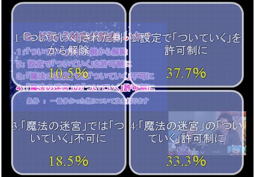 無言「ついていく」問題についても,コロシアムの問題と同じようにプレイヤーによって意識が大きく異るため,まずアンケートを実施した。これは「魔法の迷宮」などでマッチングされて,面識のない人が積極的にゲームに参加してくれず,使われているような気持ちになったり,なんとなく気味が悪いという問題だ。開発側としては当初,この件に対処する予定はなかったが,プレイヤーの声が高まってきたことで,意見を募ることにしたという。その結果,対応方法についての票は割れたものの,実現への要望は非常に高かったため,今後の検討課題に加えていくことになった。