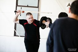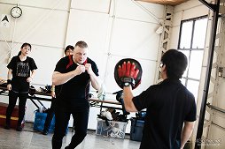 まずはオリエンテーションから。今回の講師はキャッスル・ティンタジェルのCEOであり,ドイツ剣術やドイツ流護身術全般の使い手であるジェイ・ノイズ氏だ。苦手と言いつつ,日本語でレクチャーしてくれるので,英語やドイツ語ができなくてもご安心を。