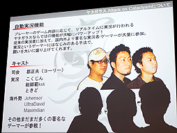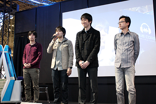 冒頭,ステージにはヤタガラスのプロモーションムービーが流れ,続いてプランナーの梅園氏,開発進行のしざ氏,JETの声を担当する市来光弘氏,そして有名格闘ゲームプレイヤーのハイタニ氏が登場し,プレゼンテーションは幕を開けた。