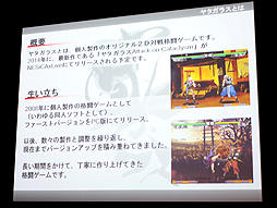 最初に語られたのは「ヤタガラス」とはいったい,どんなゲームなのかについて。その始まりから,アーケード版の決定に至るまでの経緯が梅園氏によって解説されたのだが,内容は以下のスライドとキャプションを見てほしい。