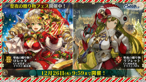 ゲーム内では2017年12月26日9:59まで,クリスマスにちなんだイベント「聖夜の贈り物フェス」が開催されている。ここでピックアップされているのは,サンタ柄の衣装に身を包んだ「聖夜の贈り物? ロレッタ」「聖夜の贈り物 リフレット」の2人だ。