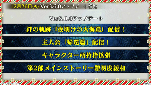 12月26日に配信されるVer 3.6.0アップデートでは,絆の軌跡「夜明けの大海篇」「主人公帰還篇」の配信をはじめ,キャラクターの初期所持枠が100に拡張されるほか,第2部メインストーリーの難度が緩和される。あわせて,帰還篇の配信記念イベントも予定されている。