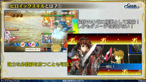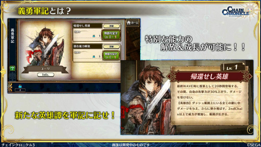 主人公帰還篇では新章ストーリーが提供されるだけでなく,ここで入手できる「主人公」には新たな要素が追加されているという。1つめの「ヒロイックスキル」は最終WAVEにキャラクターが援軍として一定時間登場するもので,2つめの「義勇軍記」は特別な能力の開放および成長に関わるものとのことだ。