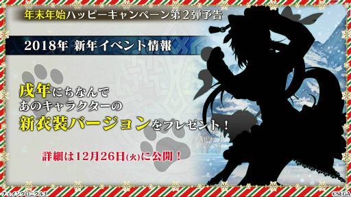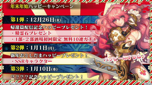 12月26日から実施される年末年始ハッピーキャンペーンではまず,第1弾「精霊石プレゼント」「第1部・第2部酒場 初回限定 無料10連ガチャ」が行われる。続く2018年1月11日にはSSRキャラを配布する「新年おとしだまハッピープレゼント」が,1月10日には「????記念ハッピープレゼント」が実施される予定だ。