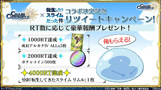 新たにコラボキャラクターとリツイートキャンペーンの情報が公開された。同キャンペーンでは,公式Twitterの当該ツイートのリツイート達成数ごとに,SSR「転生してきたスライム リムル」などの報酬を追加していくという。