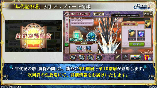 3月のアップデートでは「年代記の塔」の“黄昏の間”に第9階層,第10階層が実装される。こちらの詳細は次回の生放送にて発表するとしている。そのほか「ちぇんらじ」との連動企画や,チェン活キャンペーンのレポート紹介枠の増枠も発表された。