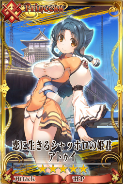 ヤマトの属国のひとつである、シャッホロの姫君。はんなりした口調とは裏腹に戦闘狂で「シャッホロの狂い姫」の異名を持つ。アンジュの地位奪還に協力したことから、八柱将の地位を得る。運命の人を探し求める、恋多き乙女。