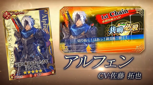 SSR「記憶と痛覚を失った青年アルフェン」をはじめとする、『テイルズ オブ』シリーズのコラボキャラクターが登場するコラボフェス第1弾を開催! SSRは必ずコラボキャラクターが登場します。